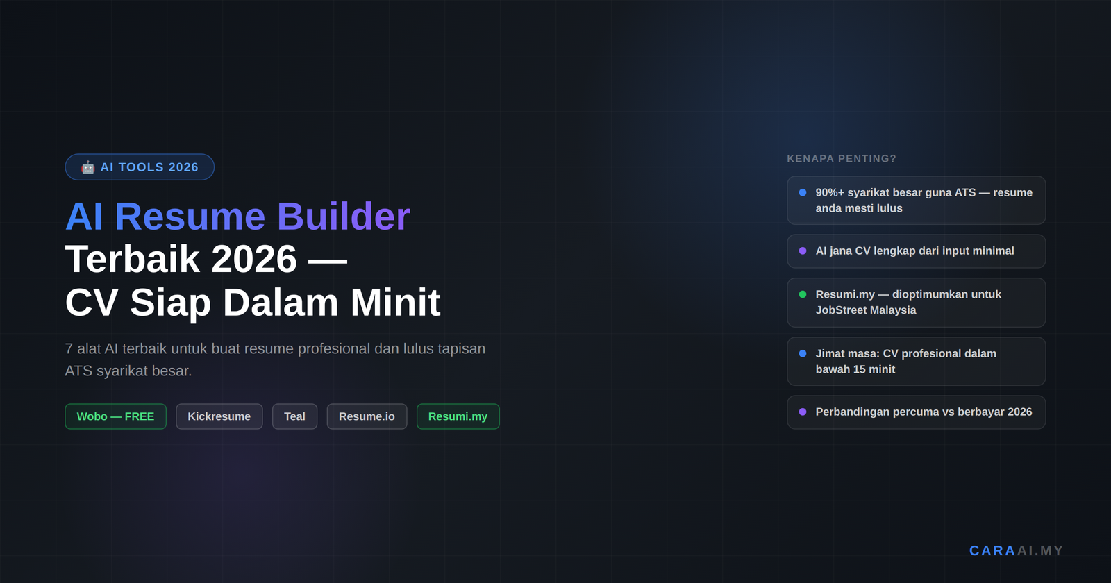 Artikel ini membandingkan 7 AI resume builder terbaik 2026, termasuk pilihan khusus untuk pasaran kerja Malaysia.