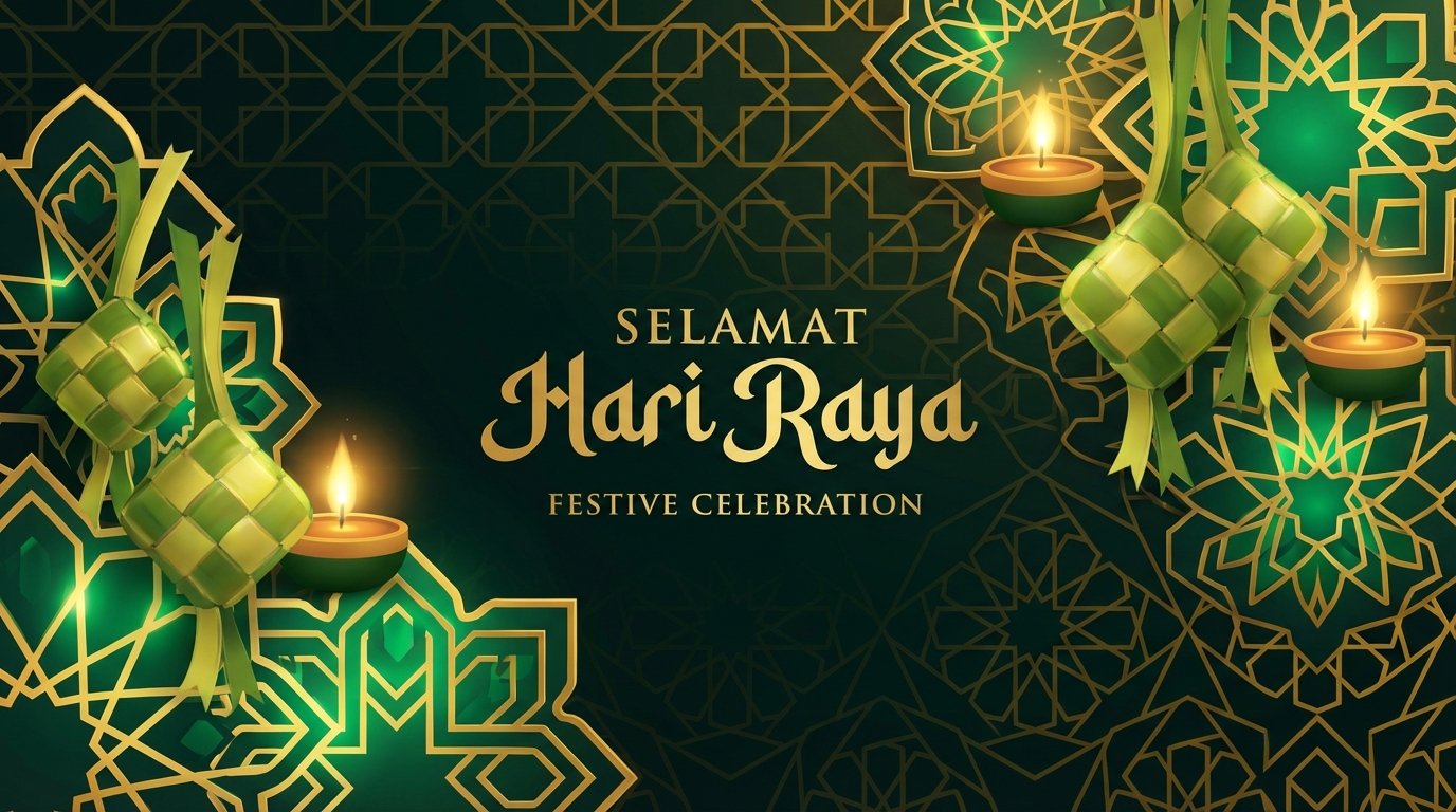 - Contoh prompt: "Greeting card for Hari Raya Aidilfitri with ketupat, mosque silhouette, crescent moon, green and gold color scheme, elegant design"