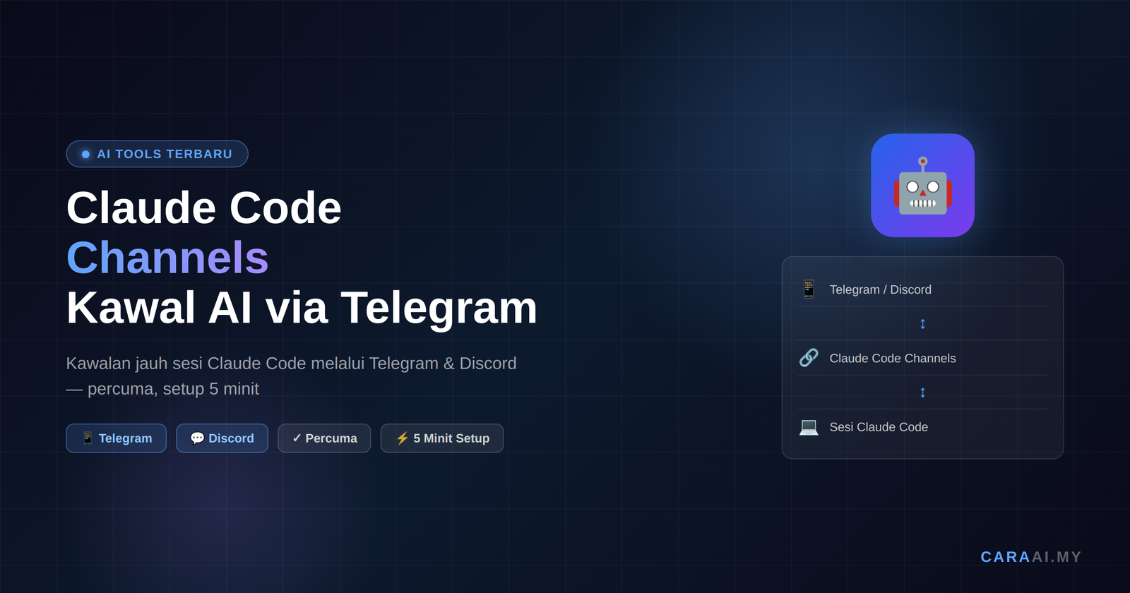 nn| Aspek | Penerangan |n|-------|-----------|n| Apa ia buat | Sambungkan Telegram/Discord ke sesi Claude Code tempatan |n| Platform disokong | Telegram, Discord (WhatsApp belum) |n| Kos | Percuma xe2x80x94 termasuk dalam Claude Code |n| Masa setup | ~5 minit |n| Syarat | Sesi Claude Code mesti aktif di komputer |nn